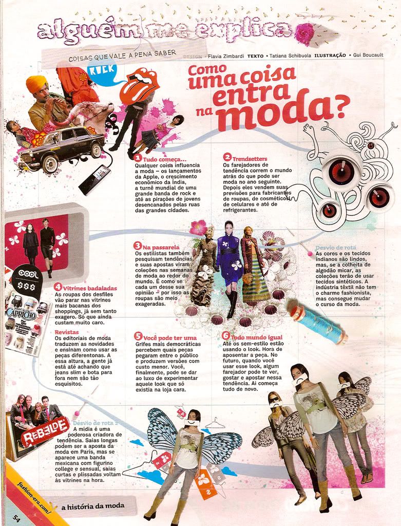 COMO UMA COISA ENTRA NA MODA A revista Capricho fez há tempos uma pagininha super explicativa pra gente saber (resumidamente) como as coisas viram moda, e vale a pena lembrar disso bem em vésperas de semanas de moda, né? Lá diz como qualquer coisa pode influenciar a moda, tipo tecnologia, música, comportamentos… e também fala da influência da indústria têxtil, da mídia, e de como as coisas chegam em versão luxo antes de serem pulverizadas em versões populares. Bem vida real. Aqui tem a página em tamanhão (que dá pra ler) e aqui tem todas as etapas descritas na revista (a gente ama a parte de moda da Capricho, sabia?).